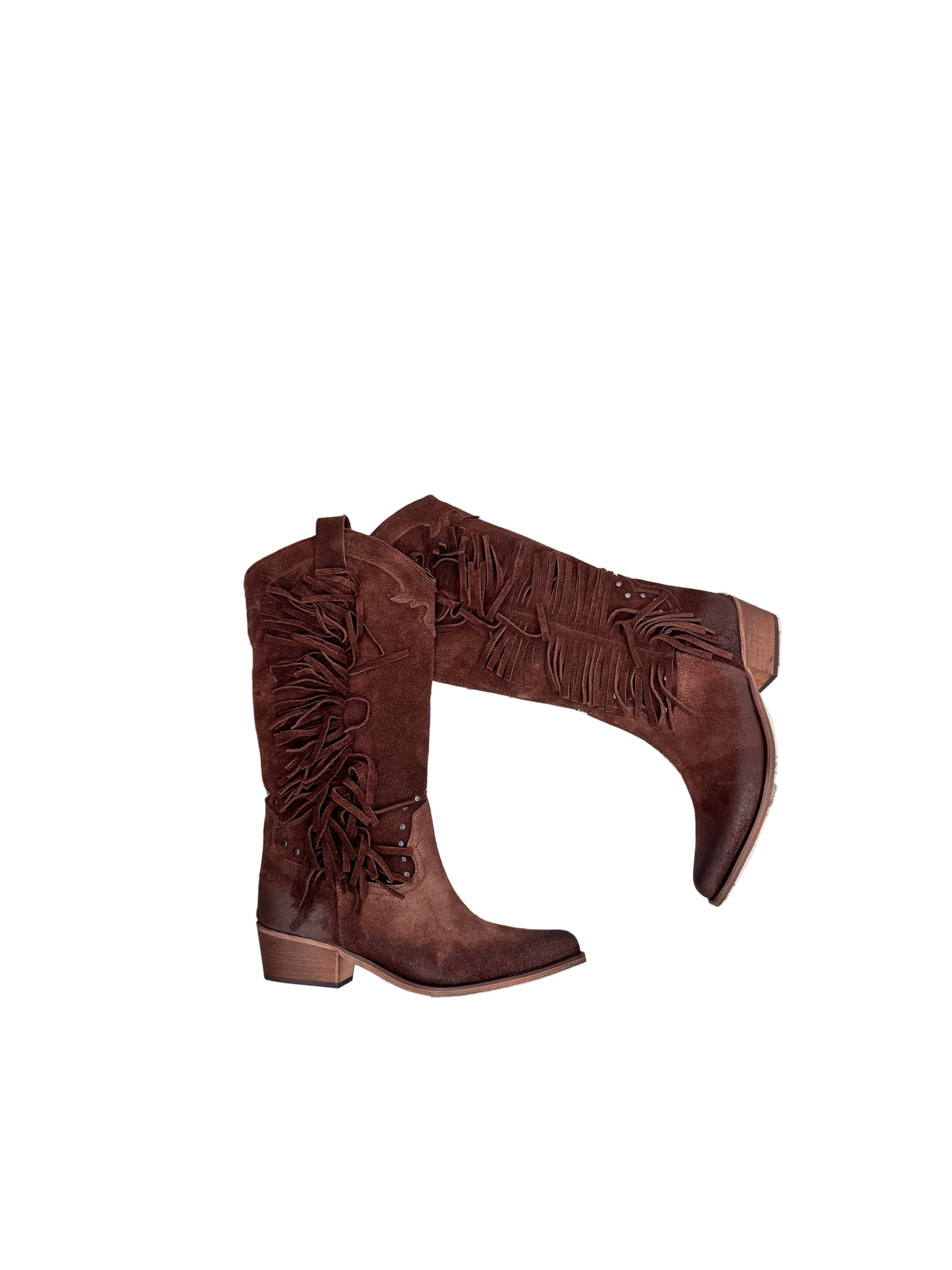 RIVISITA LO STILE WESTERN CON UN TOCCO CONTEMPORANEO GRAZIE A QUESTI STIVALI TEXANI IN MORBIDO CAMOSCIO MARRONE. IL DESIGN PRESENTA FRANGE LATERALI DECORATIVE E DETTAGLI METALLICI CHE AGGIUNGONO CARATTERE E MOVIMENTO A OGNI PASSO. LA PUNTA AFFUSOLATA E IL TACCO MEDIO DI 5CM SQUADRATO GARANTISCONO COMFORT E SLACIO, PERFETTI SIA PER LOOK CASUAL CON JEANS CHE PER OUTFIT PIU' RICERCATO CON ABITI O GOMME.